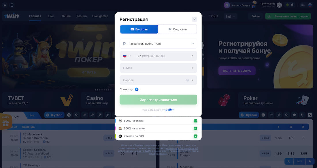 Как и любой букмекер предлагает своим новым клиентам бонус за регистрацию на официальном сайте 1вин. Чтобы получить его, нужно на самом первом этапе создания аккаунта ввести бонусный промокод. После этого остается только внести первый депозит.